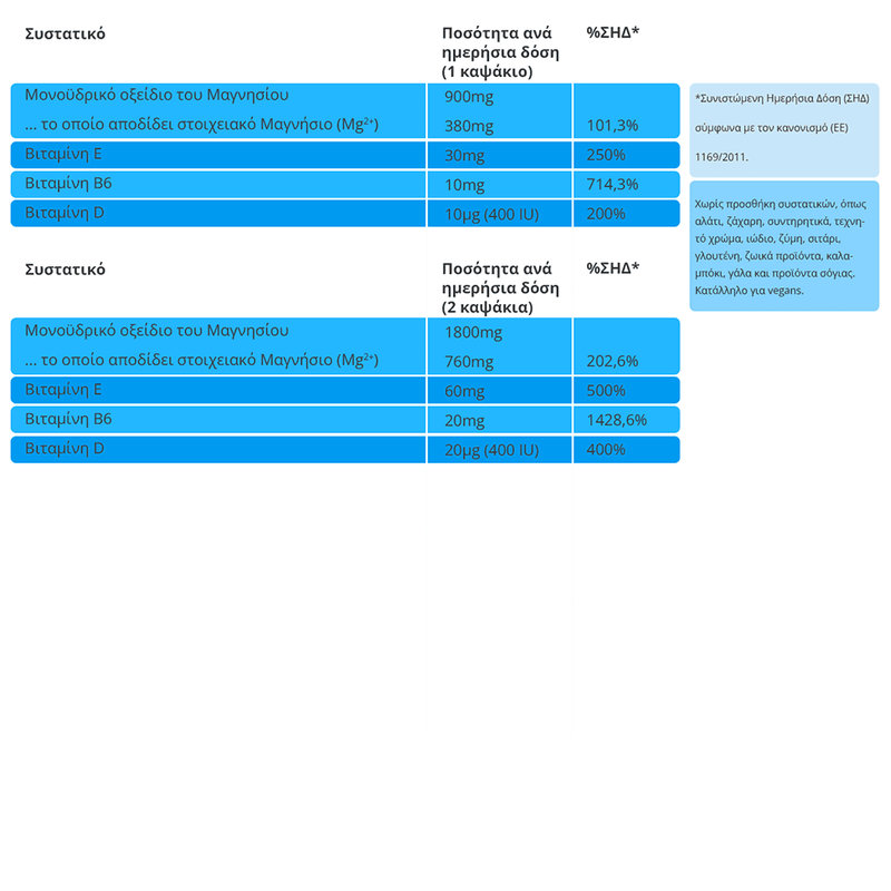 Συμπλήρωμα διατροφής που περιέχει Μαγνήσιο σε πατενταρισμένη μορφή Μονοϋδρικού Οξειδίου του Μαγνησίου, μαζί με βιταμίνες D, Ε και Β6, οι οποίες δρουν συνεργιστικά με το μαγνήσιο. Περισσότερα