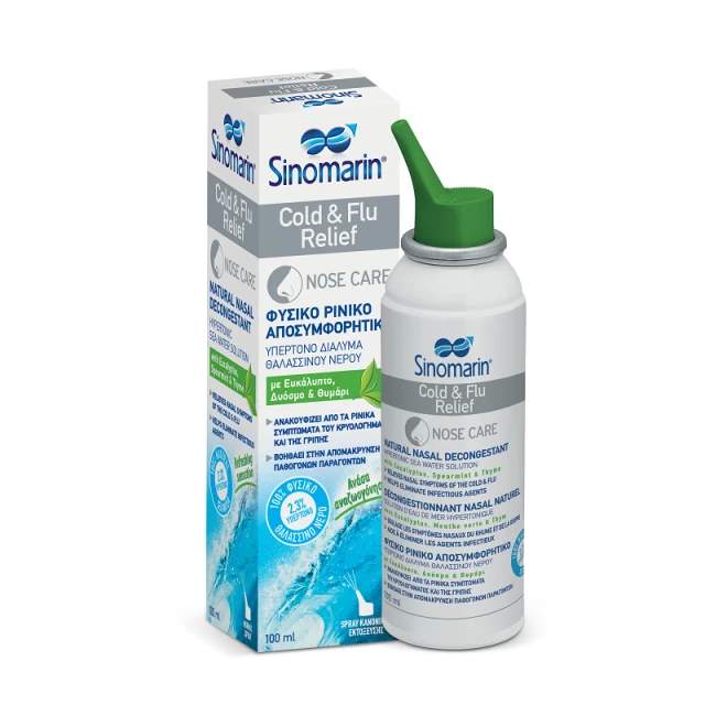 Η αποτελεσματικότητα του Sinomarin® Cold & Flu Relief οφείλεται στην αποσυμφορητική δράση (μέσω ώσμωσης) του υπέρτονου διαλύματος θαλασσινού νερού (2,3% σε NaCl), καθώς και στις καλά τεκμηριωμένες & ευεργετικές- για τον ρινικό βλεννογόνο- ιδιότητες των αιθέριων ελαίων ευκαλύπτου & δυόσμου καθώς και του εκχυλίσματος θυμαριού. Το προϊόν περιέχει και γλυκερίνη για επιπλέον ενυδάτωση στην ερεθισμένη μύτη.