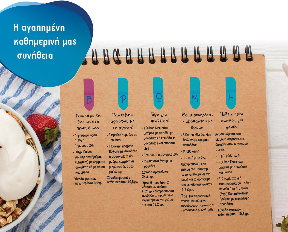 Τα προϊόντα πίτουρου βρώμης Dukan περιέχουν ως αποκλειστικό συστατικό το πίτουρο βρώμης, χωρίς να περιέχουν ζάχαρη. Βάζουμε λοιπόν στη διατροφή μας 2-3 μερίδες πίτουρου βρώμης ημερησίως, απολαμβάνοντας μοναδικές γλυκές γεύσεις χωρίς