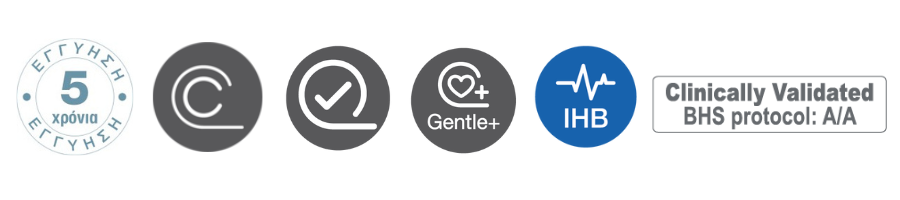 Ψηφιακό πιεσόμετρο μπράτσου με τεχνολογία IHB για ανίχνευση αρρυθμιών και τεχνολογία Gentle+ για άνετες μετρήσεις.