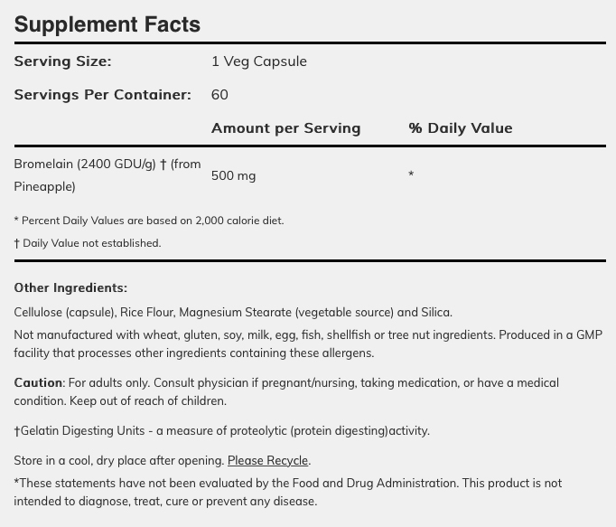 Η βρωμελαΐνη μπορεί να βγει σε διαφορετική περιεκτικότητα και βάρος ανά δόση εντός του σκευάσματος, επηρεάζοντας τις τιμές που εμφανίζονται στις ετικέτες. Για παράδειγμα, μερικά προϊόντα βρωμελαΐνης έχουν τεκμηριωμένη ενζυμική δραστικότητα 2400 GDU/γραμμάριο, έτσι 500 mg (500 χιλιοστογραμμάρια, είναι ίσα με μισό γραμμάριο) αυτού του υλικού θα έχουν 1200 ενζυμική δραστικότητα GDU ανά κάψουλα (2400 GDU/γραμμάρια επί 0,5 γραμμάρια=1200 GDU ανά κάψουλα).