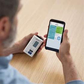 • Mέσω της εφαρμογής Omron connect για κινητά iPhone & Android εσείς και ο ιατρός σας έχετε αυτόματα την πλήρη εικόνα και διαχείριση της πίεσής σας από το κινητό (ελέγξτε τη συμβατότητα του κινητού σας στο www.omronconnect.com)