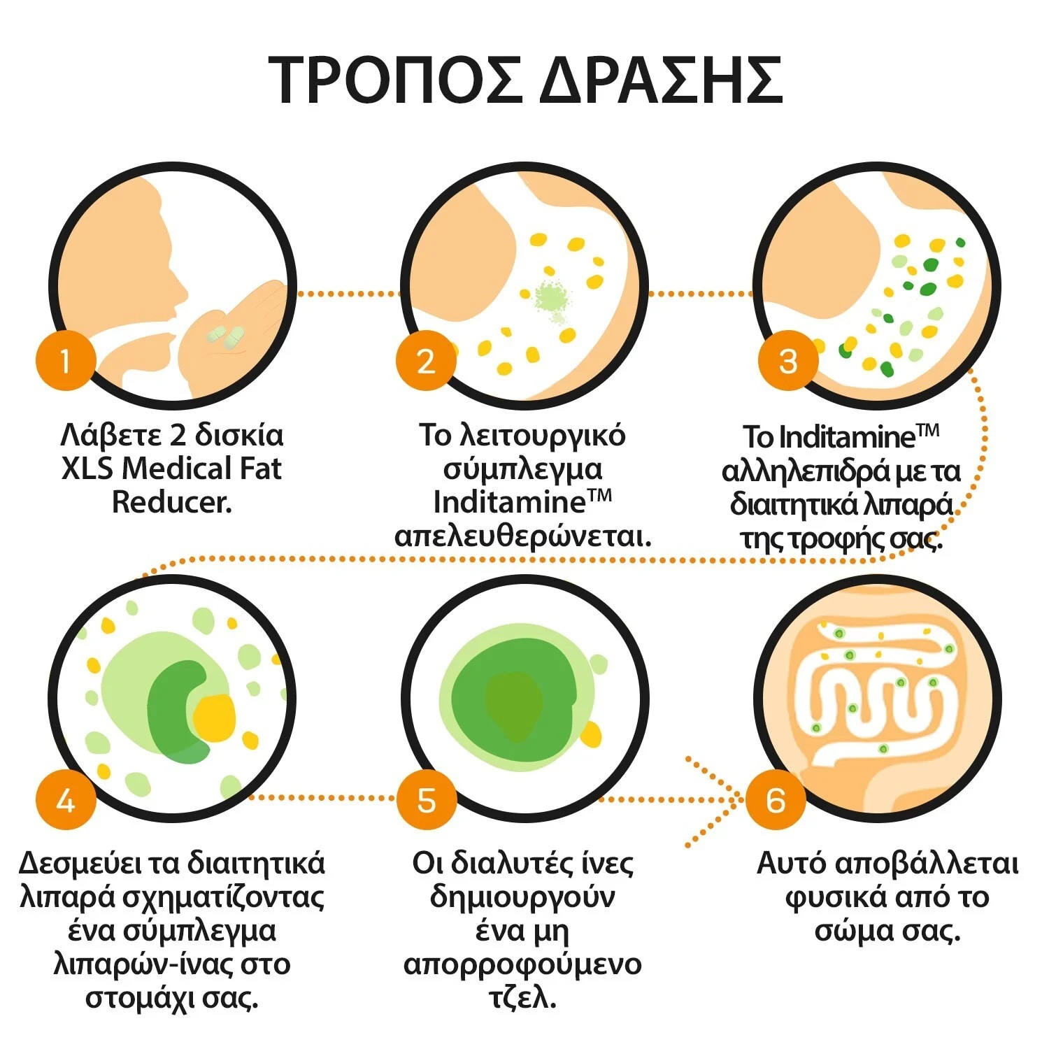 Ενώ τρώμε, λιπαρά από την τροφή μας απελευθερώνονται στο στομάχι μας. Όταν λαμβάνουμε 2 δισκία XLS Medical Fat Reducer, μετά το κυρίως γεύμα με ένα ποτήρι νερό, απελευθερώνεται το λειτουργικό σύμπλεγμα Inditamine™ και αλληλοεπιδρά με τα διατροφικά λιπαρά. Οι αδιάλυτες ίνες της Inditamine™ παγιδεύουν τα διατροφικά λιπαρά και οι διαλυτές ίνες της Inditamine™ δημιουργούν ένα τζελ, καθιστώντας το σύμπλεγμα λιπαρών-ίνας δύσπεπτο στο στομάχι. Έτσι, αποβάλλεται φυσικά από το σώμα.